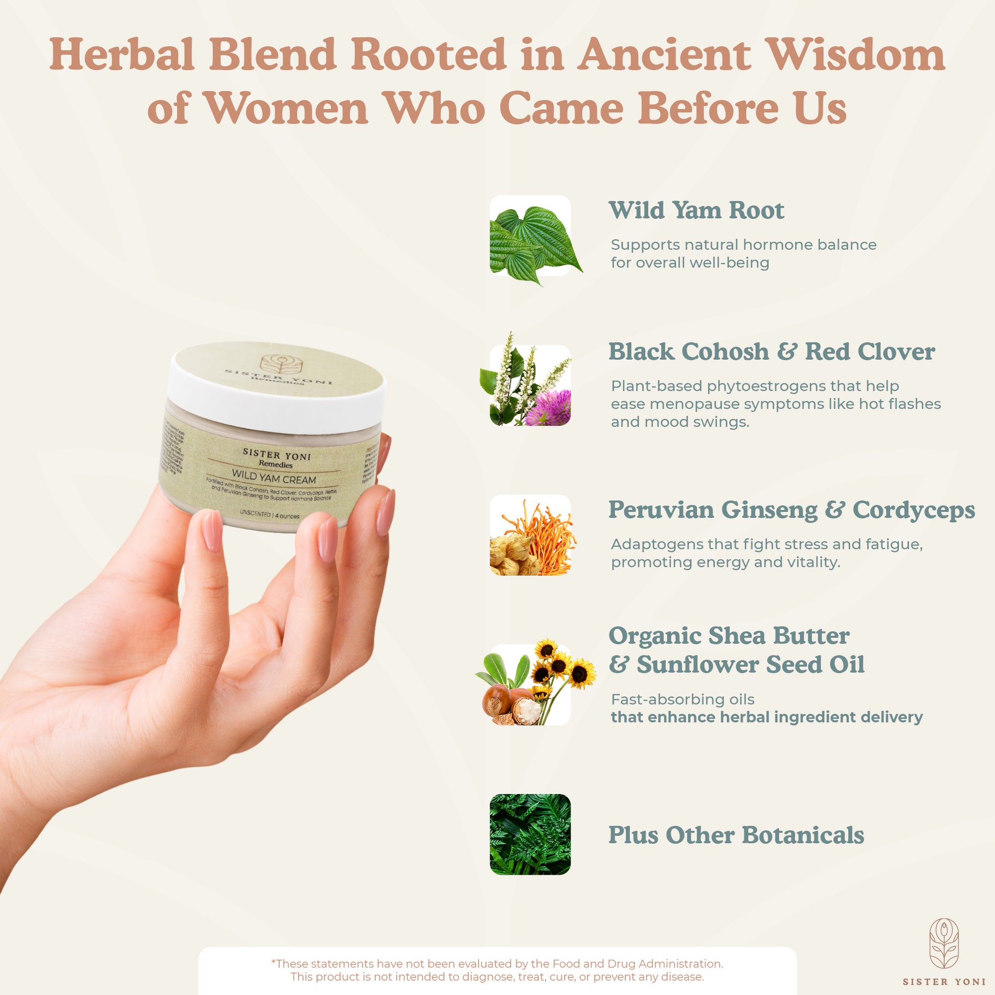 Handcrafted in small batches in the USA, Sister Yoni’s Wild Yam Cream is created with care to meet the needs of women seeking balance and vitality at every stage of life.